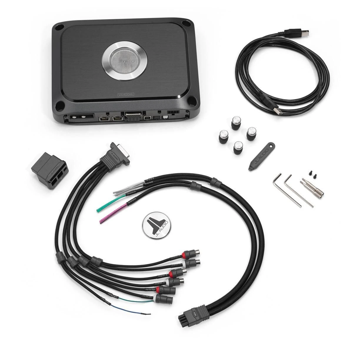 - Anstelle herkömmlicher Bedienknöpfe und Schalter werden alle Verstärkereinstellungen und DSP-Funktionen über ein kompatibles externes Gerät (PC, Tablet oder Smartphone) konfiguriert, wobei die entsprechende JL Audio TüN -Softwareanwendung installiert ist.